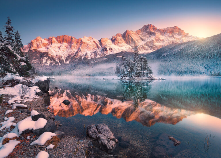 Lake Eibsee in den bayrischen Alpen früh am Morgen in magischer Lichtstimmung