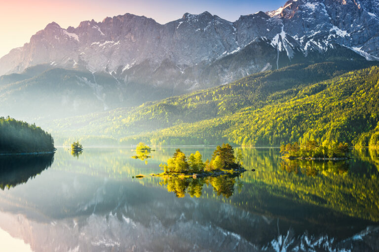 Hintersee bei Ramsau in Bayern im warmen Licht der untergehenden Sonne