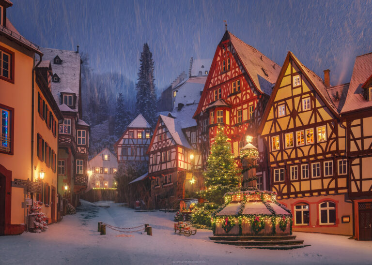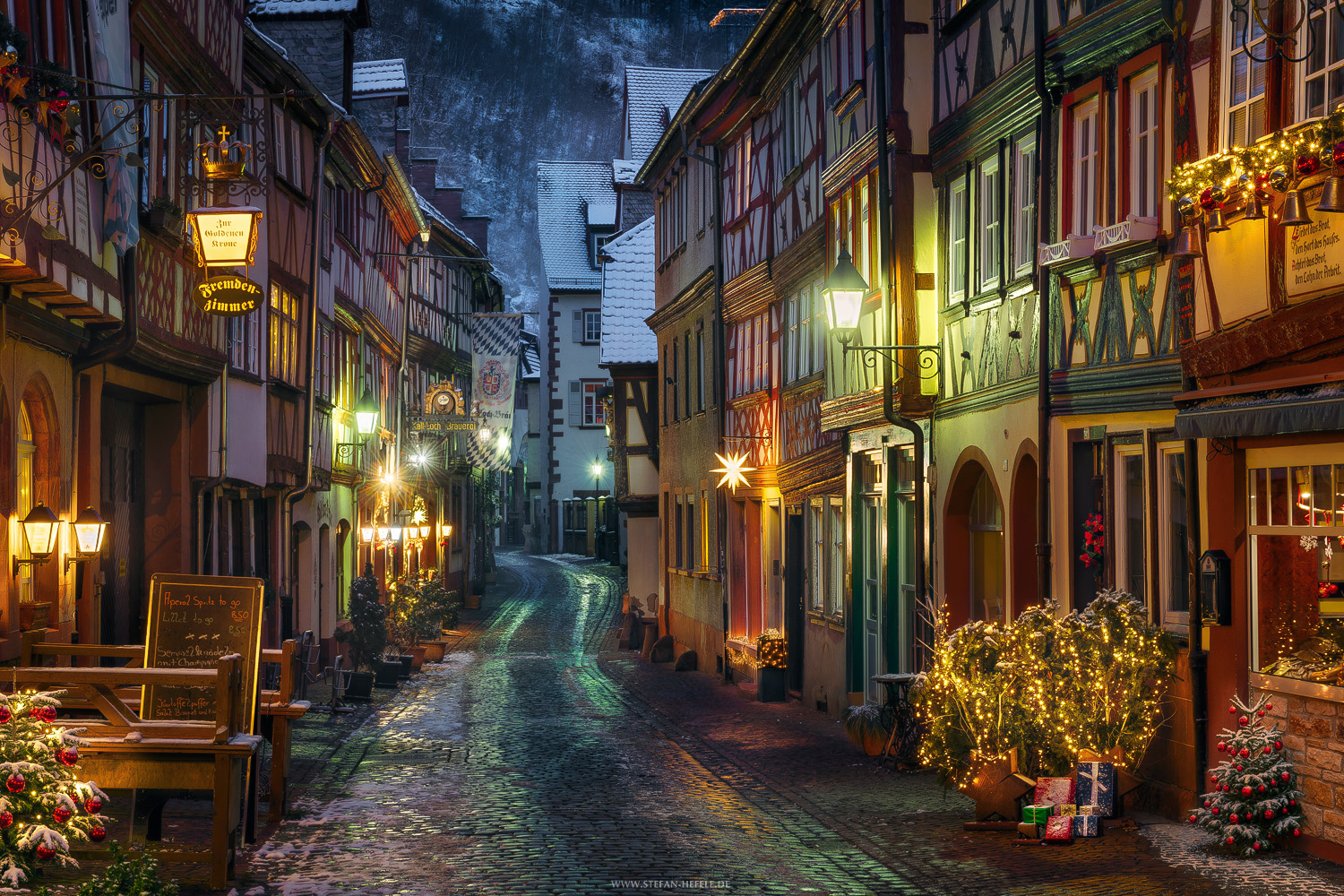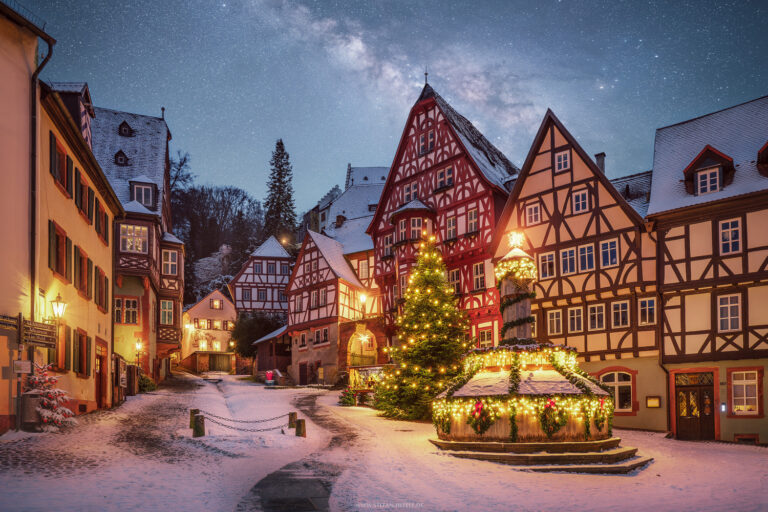 Rothenburg ob der Tauber in einer märchenhaften Winteransicht mit den Lichtern der Stadt im frühen Zwielicht