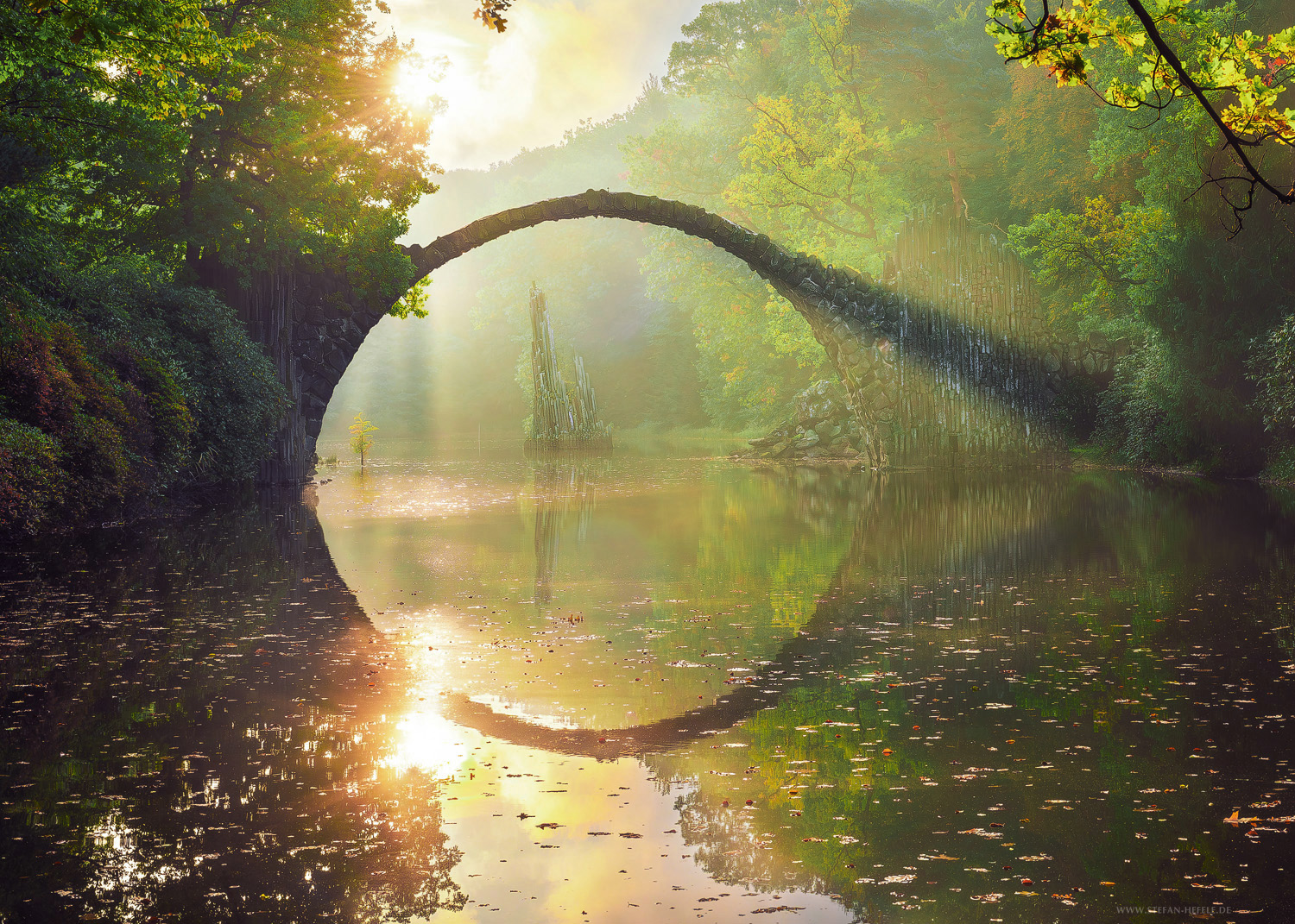 Rakotzbrücke im Kromlauer Rhododendronpark in Sachsen in nebligen Sonnenaufgang im Herbst, Deutschland
