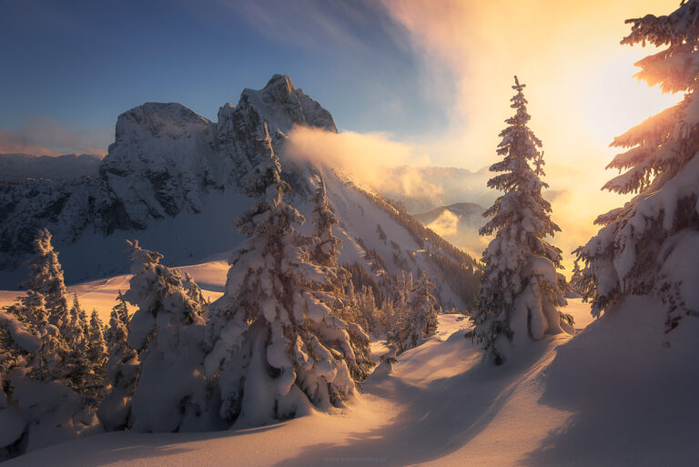 Aggenstein in the Bavarian Alps covered in snow, bathed in a fairytale-like light